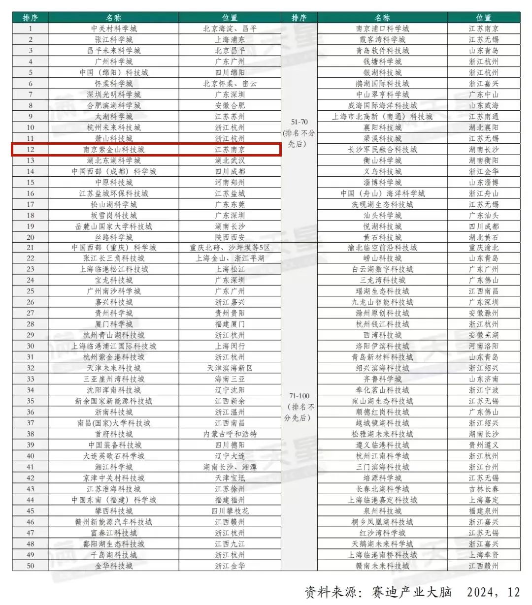 在此次榜单中紫金山科技城排名全国第十二位。